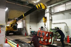 車輪転削盤は大型で特殊な構造の機械であるため、現場によっては搬入に専用のガントリークレーンを用いることがあります。